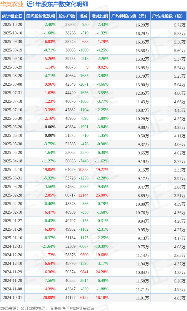 从股价来看,2025年10月10日至2025年10月20日,华英农业区间跌幅为2.4%,在此期间股东户数减少930.0户,减幅为2.43%。