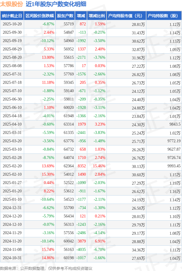 从股价来看,2025年9月30日至2025年10月20日,太极股份区间跌幅为6.87%,在此期间股东户数增加872.0户,增幅为1.59%。