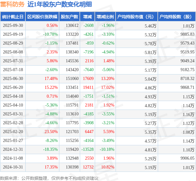 从股价来看,2025年9月19日至2025年9月30日,雷科防务区间涨幅为0.56%,在此期间股东户数减少2608.0户,减幅为1.96%。