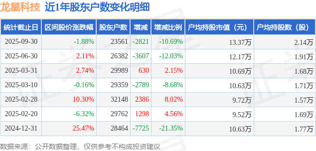 证券之星消息,近日龙星科技披露,截至2025年9月30日公司股东户数为2.36万户,较6月30日减少2821.0户,减幅为10.69%。户均持股数量由上期的1.91万股增加至2.14万股,户均持股市值为13.37万元。