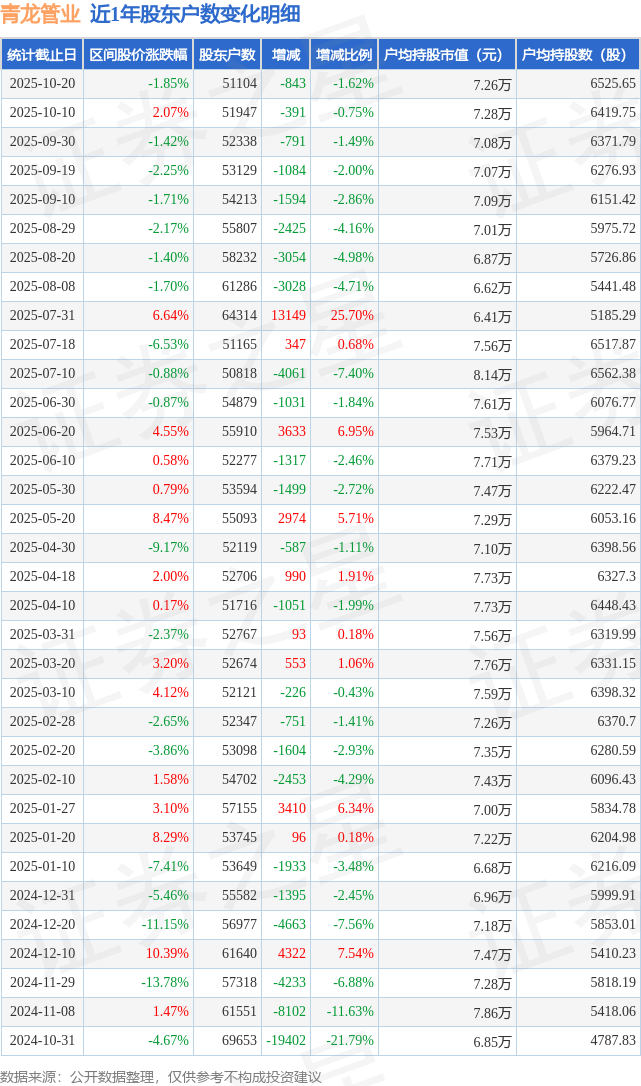 从股价来看,2025年10月10日至2025年10月20日,青龙管业区间跌幅为1.85%,在此期间股东户数减少843.0户,减幅为1.62%。
