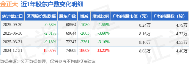 从股价来看,2025年6月30日至2025年9月30日,金正大区间跌幅为0.58%,在此期间股东户数减少1080.0户,减幅为1.55%。