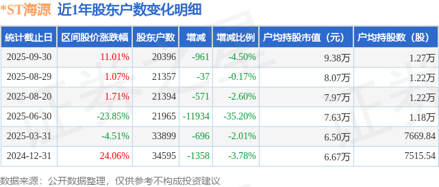 从股价来看,2025年8月29日至2025年9月30日,*ST海源区间涨幅为11.01%,在此期间股东户数减少961.0户,减幅为4.5%。
