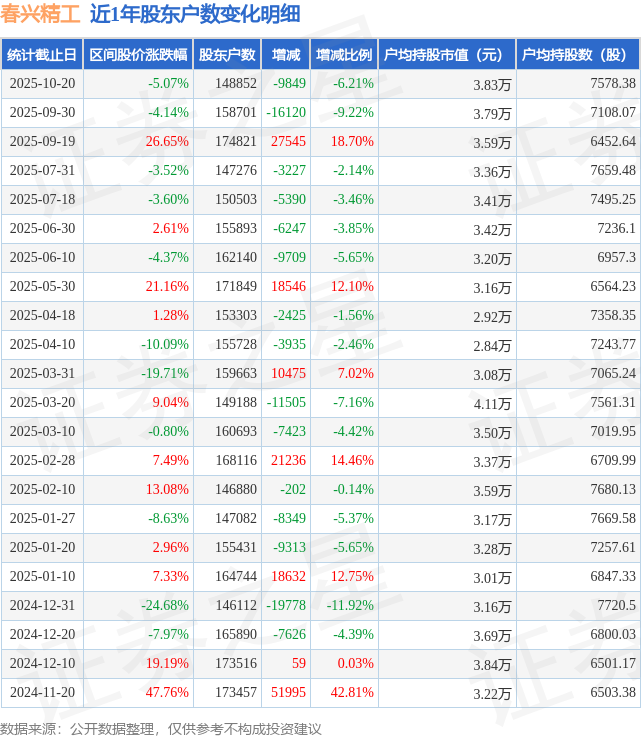 从股价来看,2025年9月30日至2025年10月20日,春兴精工区间跌幅为5.07%,在此期间股东户数减少9849.0户,减幅为6.21%。