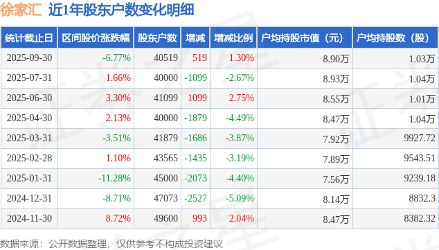 从股价来看,2025年8月31日至2025年9月30日,徐家汇区间跌幅为6.77%,在此期间股东户数增加519.0户,增幅为1.3%。