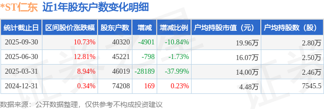 从股价来看,2025年6月30日至2025年9月30日,*ST仁东区间涨幅为10.73%,在此期间股东户数减少4901.0户,减幅为10.84%。