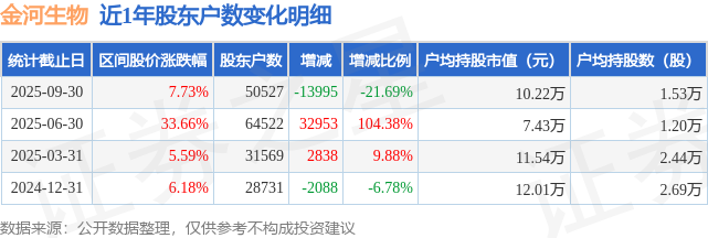 从股价来看,2025年6月30日至2025年9月30日,金河生物区间涨幅为7.73%,在此期间股东户数减少1.4万户,减幅为21.69%。