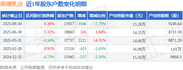 从股价来看,2025年6月30日至2025年9月30日,燕塘乳业区间涨幅为0.3%,在此期间股东户数减少1046.0户,减幅为5.79%。