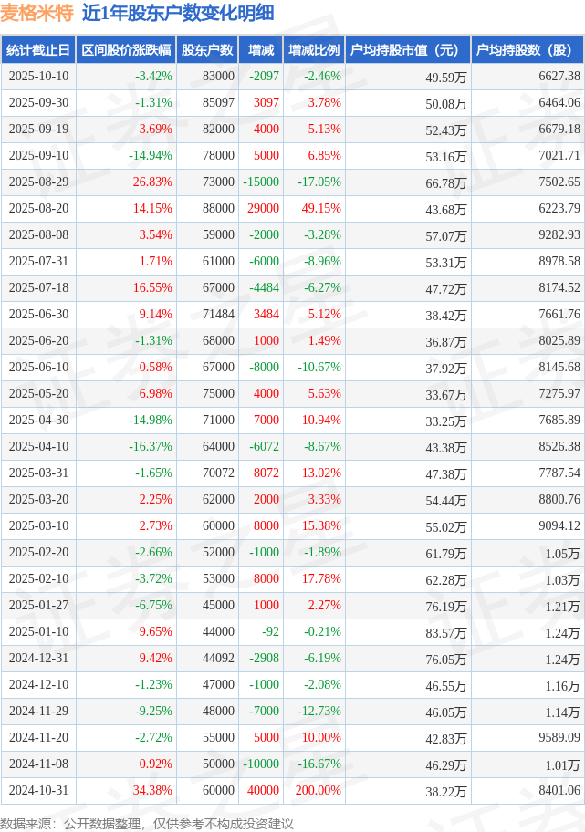 从股价来看,2025年9月30日至2025年10月10日,麦格米特区间跌幅为3.42%,在此期间股东户数减少2097.0户,减幅为2.46%。