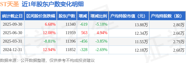 从股价来看,2025年6月30日至2025年9月30日,ST天圣区间涨幅为6.68%,在此期间股东户数减少619.0户,减幅为5.18%。