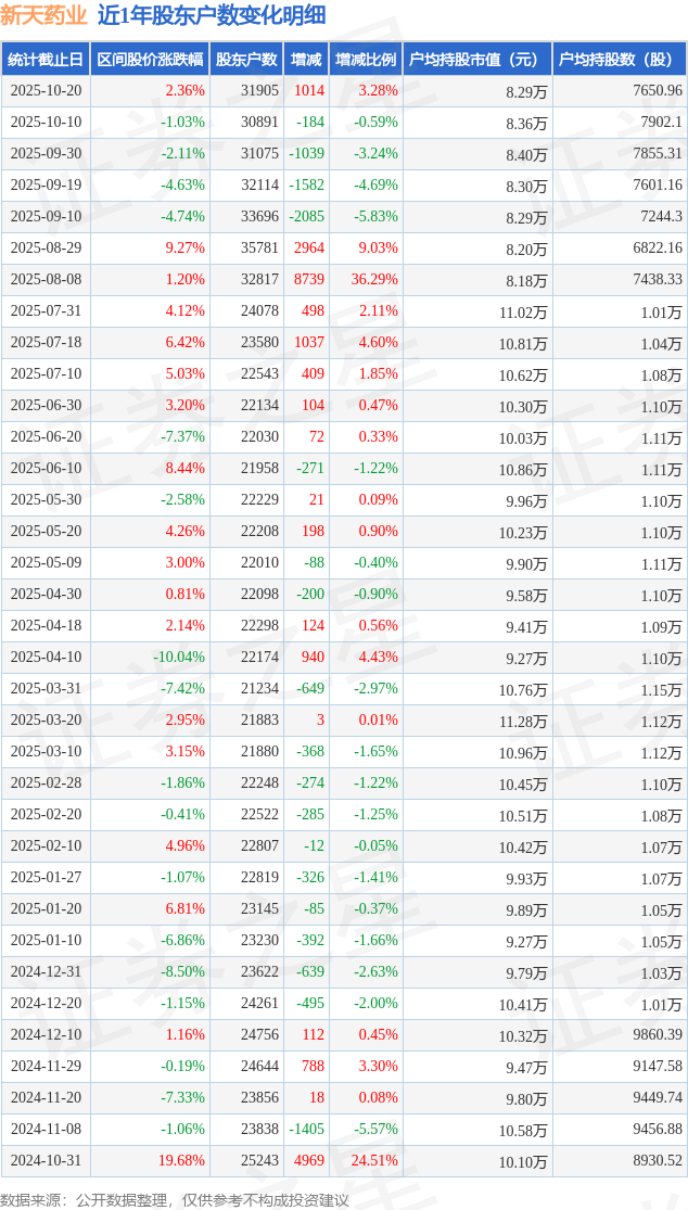 从股价来看,2025年10月10日至2025年10月20日,新天药业区间涨幅为2.36%,在此期间股东户数增加1014.0户,增幅为3.28%。