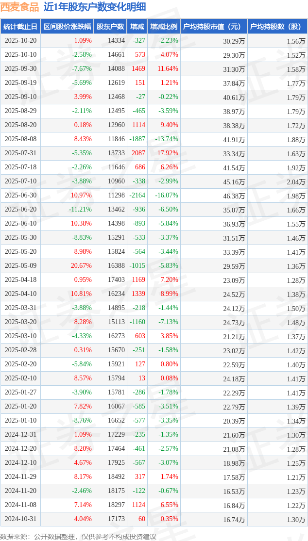 从股价来看,2025年10月10日至2025年10月20日,西麦食品区间涨幅为1.09%,在此期间股东户数减少327.0户,减幅为2.23%。