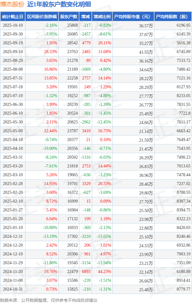 从股价来看,2025年9月30日至2025年10月10日,博杰股份区间跌幅为2.16%,在此期间股东户数减少217.0户,减幅为0.83%。