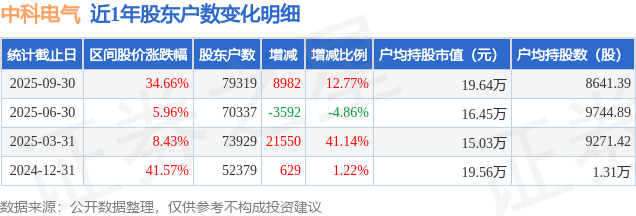 证券之星消息,近日中科电气披露,截至2025年9月30日公司股东户数为7.93万户,较6月30日增加8982.0户,增幅为12.77%。户均持股数量由上期的9745.0股减少至8641.0股,户均持股市值为19.64万元。