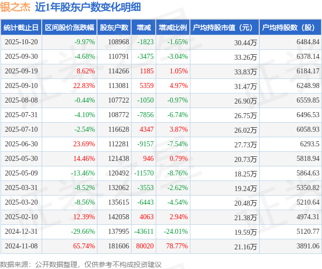 从股价来看,2025年9月30日至2025年10月20日,银之杰区间跌幅为9.97%,在此期间股东户数减少1823.0户,减幅为1.65%。