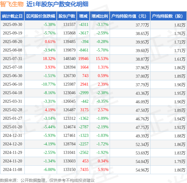 从股价来看,2025年9月19日至2025年9月30日,智飞生物区间跌幅为5.38%,在此期间股东户数减少4311.0户,减幅为3.17%。