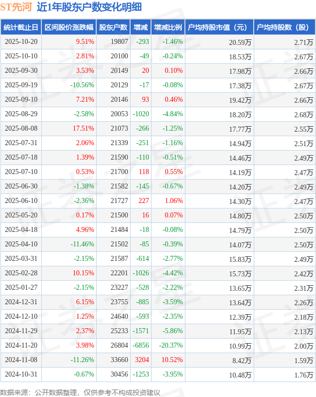 从股价来看,2025年10月10日至2025年10月20日,ST先河区间涨幅为9.51%,在此期间股东户数减少293.0户,减幅为1.46%。