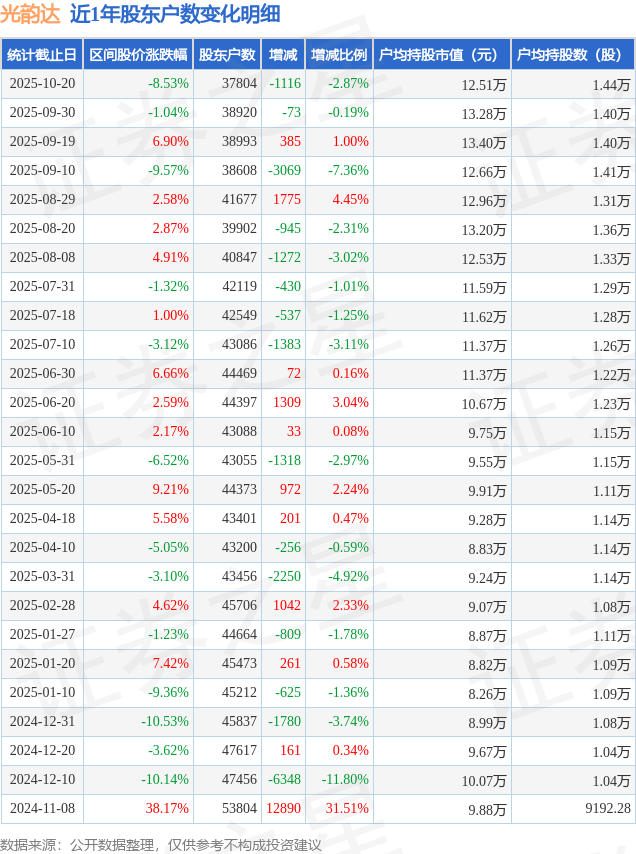 从股价来看,2025年9月30日至2025年10月20日,光韵达区间跌幅为8.53%,在此期间股东户数减少1116.0户,减幅为2.87%。
