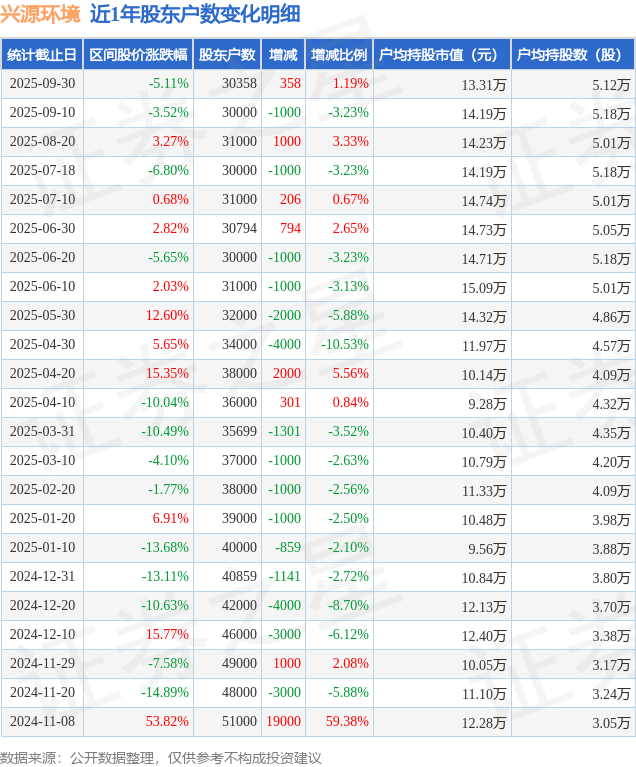 从股价来看,2025年9月10日至2025年9月30日,兴源环境区间跌幅为5.11%,在此期间股东户数增加358.0户,增幅为1.19%。
