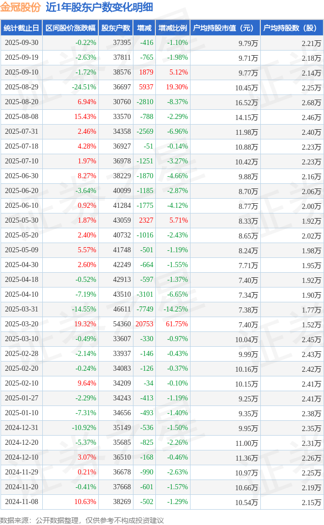 从股价来看,2025年9月19日至2025年9月30日,金冠股份区间跌幅为0.22%,在此期间股东户数减少416.0户,减幅为1.1%。