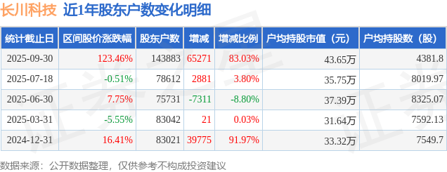 从股价来看,2025年7月20日至2025年9月30日,长川科技区间涨幅为123.46%,在此期间股东户数增加6.53万户,增幅为83.03%。