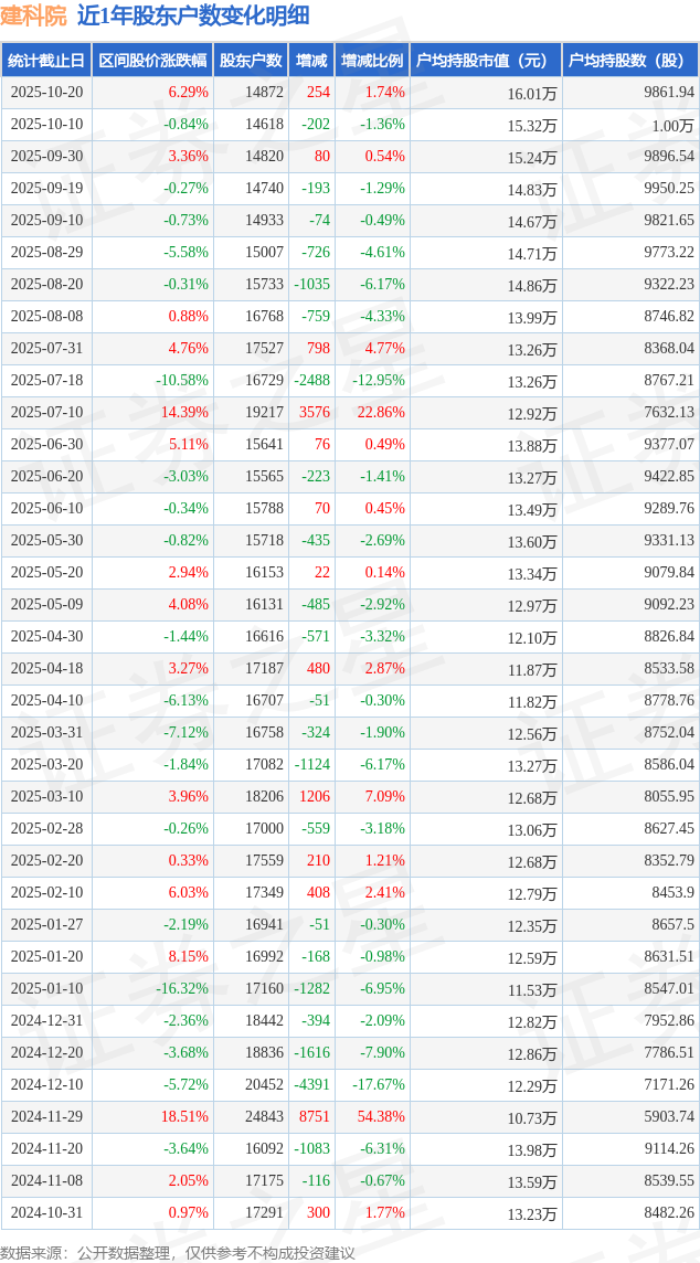 从股价来看,2025年10月10日至2025年10月20日,建科院区间涨幅为6.29%,在此期间股东户数增加254.0户,增幅为1.74%。