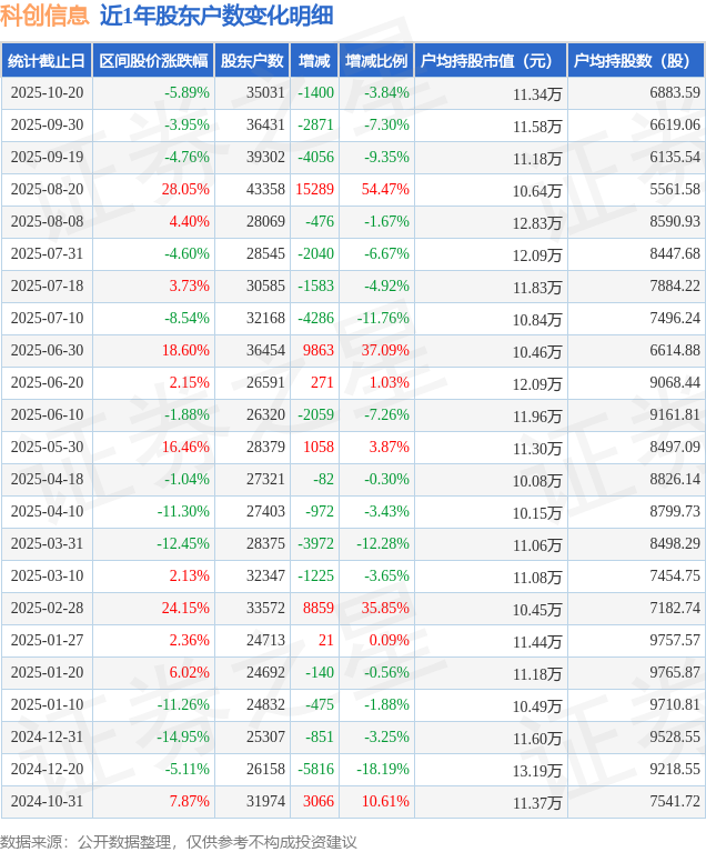 从股价来看,2025年9月30日至2025年10月20日,科创信息区间跌幅为5.89%,在此期间股东户数减少1400.0户,减幅为3.84%。