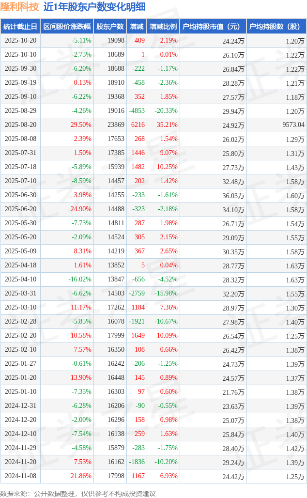 从股价来看,2025年10月10日至2025年10月20日,隆利科技区间跌幅为5.11%,在此期间股东户数增加409.0户,增幅为2.19%。