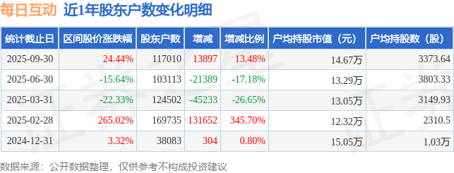 从股价来看,2025年6月30日至2025年9月30日,每日互动区间涨幅为24.44%,在此期间股东户数增加1.39万户,增幅为13.48%。