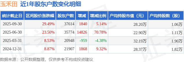 从股价来看,2025年6月30日至2025年9月30日,玉禾田区间涨幅为29.49%,在此期间股东户数增加1840.0户,增幅为5.14%。