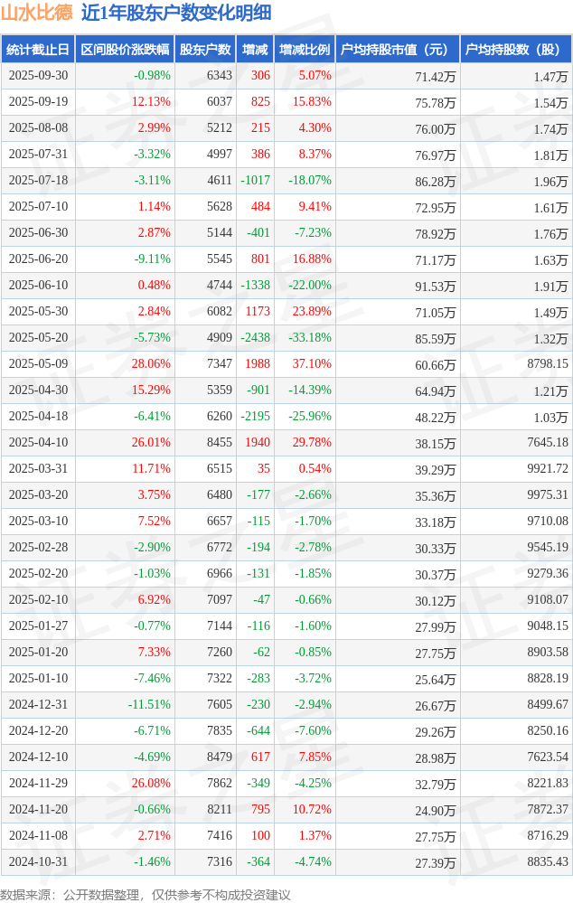 从股价来看,2025年9月19日至2025年9月30日,山水比德区间跌幅为0.98%,在此期间股东户数增加306.0户,增幅为5.07%。