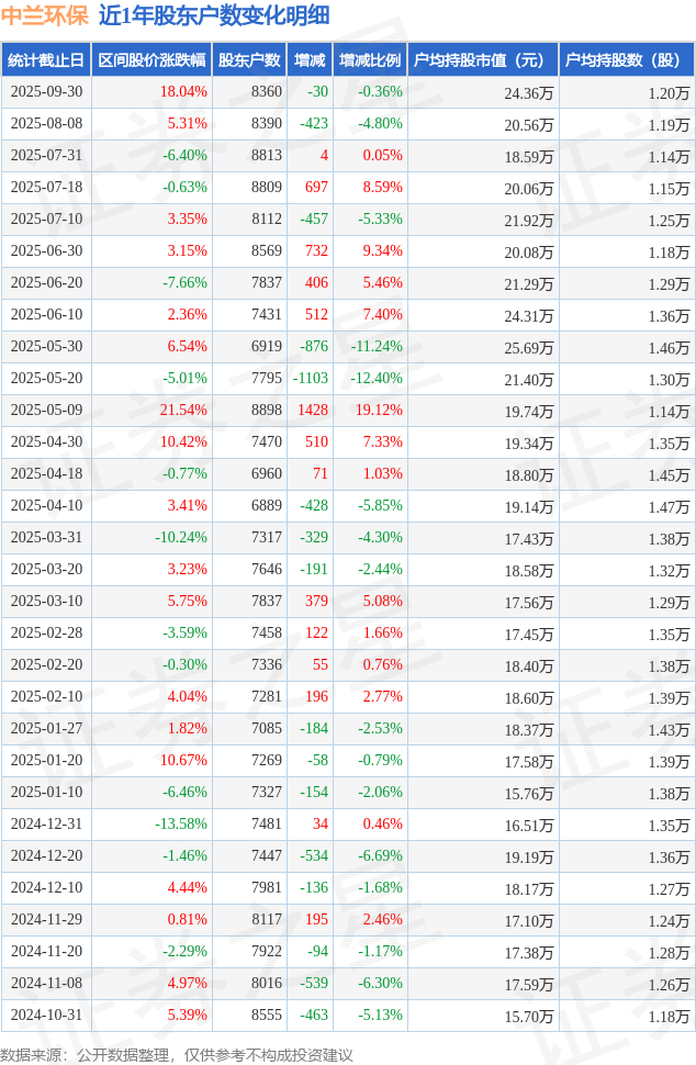 从股价来看,2025年8月8日至2025年9月30日,中兰环保区间涨幅为18.04%,在此期间股东户数减少30.0户,减幅为0.36%。