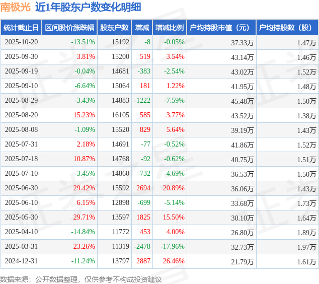 从股价来看,2025年9月30日至2025年10月20日,南极光区间跌幅为13.51%,在此期间股东户数减少8.0户,减幅为0.05%。