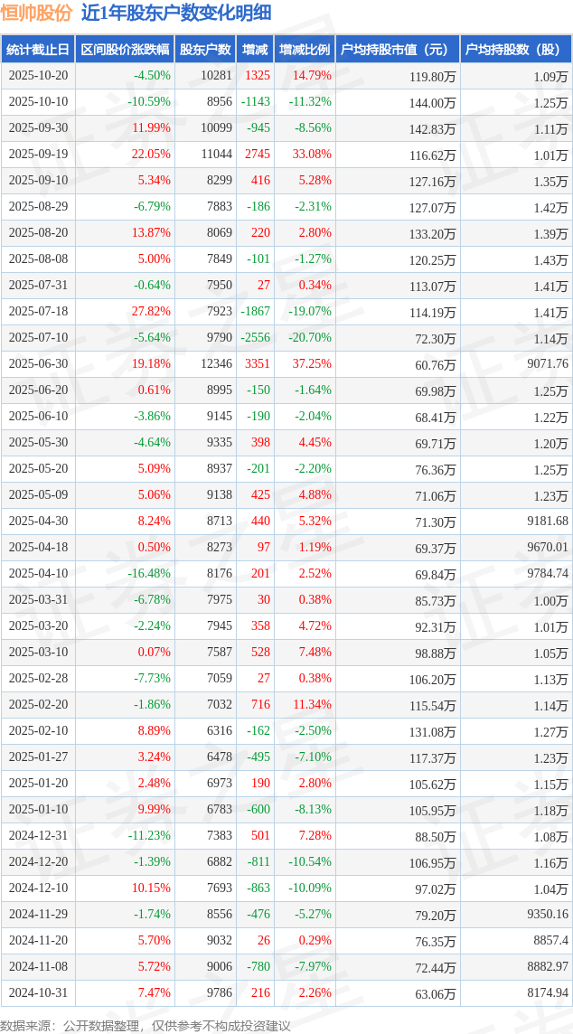 从股价来看,2025年10月10日至2025年10月20日,恒帅股份区间跌幅为4.5%,在此期间股东户数增加1325.0户,增幅为14.79%。
