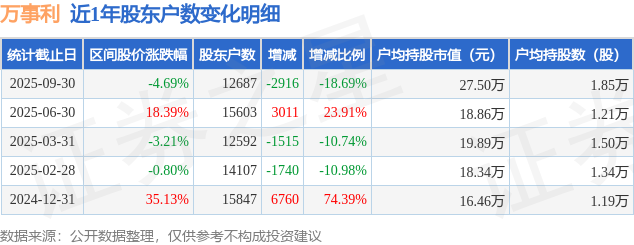 从股价来看,2025年6月30日至2025年9月30日,万事利区间跌幅为4.69%,在此期间股东户数减少2916.0户,减幅为18.69%。