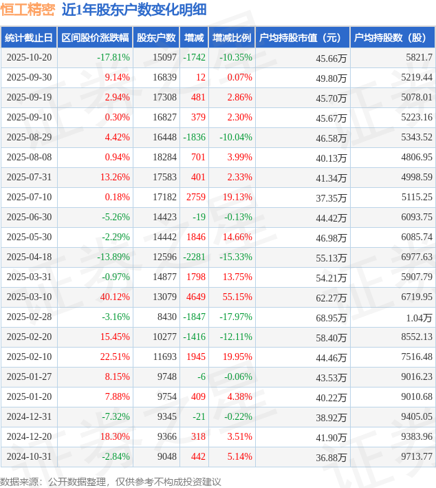 从股价来看,2025年9月30日至2025年10月20日,恒工精密区间跌幅为17.81%,在此期间股东户数减少1742.0户,减幅为10.35%。