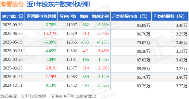 从股价来看,2025年6月30日至2025年9月30日,海看股份区间跌幅为6.76%,在此期间股东户数减少682.0户,减幅为5.38%。