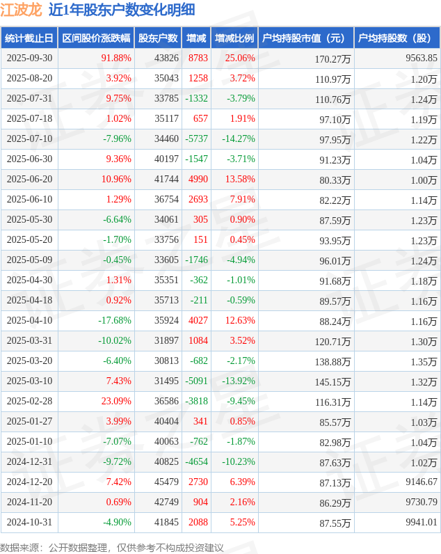 从股价来看,2025年8月20日至2025年9月30日,江波龙区间涨幅为91.88%,在此期间股东户数增加8783.0户,增幅为25.06%。