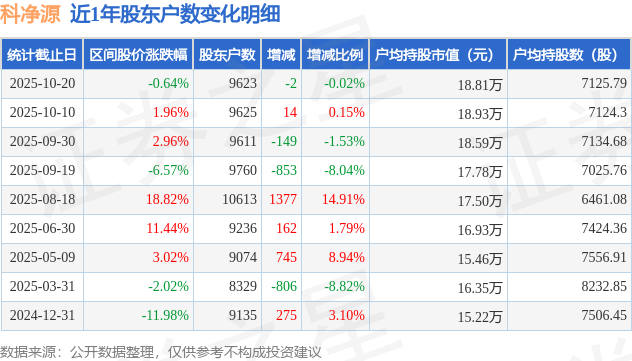 从股价来看,2025年10月10日至2025年10月20日,科净源区间跌幅为0.64%,在此期间股东户数减少2.0户,减幅为0.02%。