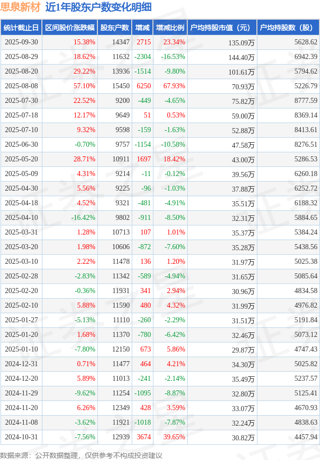 从股价来看,2025年8月29日至2025年9月30日,思泉新材区间涨幅为15.38%,在此期间股东户数增加2715.0户,增幅为23.34%。