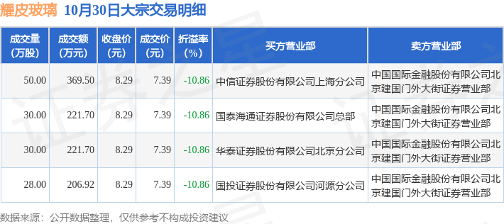 证券之星消息,10月30日耀皮玻璃发生大宗交易,交易数据如下: