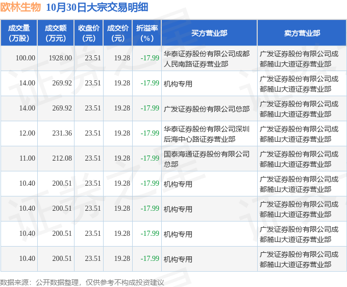 证券之星消息,10月30日欧林生物发生大宗交易,交易数据如下: