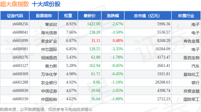 资金流向方面,超大盘(000043)指数成份股当日主力资金净流出合计49.67亿元,游资资金净流入合计24.3亿元,散户资金净流入合计25.37亿元。成份股资金流向详情见下表: