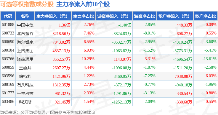 资金流向方面,可选等权(000073)指数成份股当日主力资金净流出合计13.7亿元,游资资金净流入合计3.43亿元,散户资金净流入合计10.27亿元。成份股资金流向详情见下表: