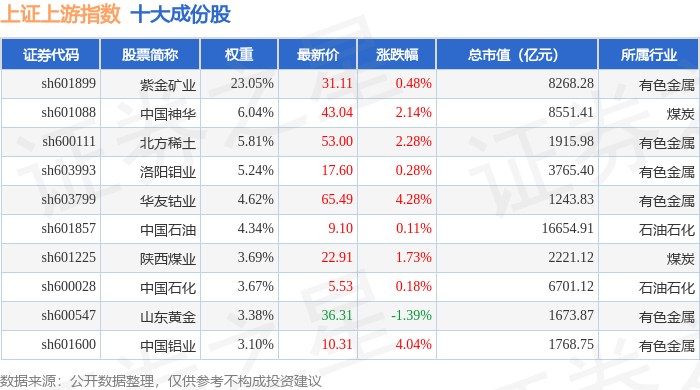 证券之星消息,10月30日,上证上游(000094)指数报收于4352.21点,涨0.59%,成交956.94亿元,换手率1.17%。当日该指数成份股中,上涨的有23家,华阳股份以4.4%的涨幅领涨,下跌的有23家,方大炭素以3.68%的跌幅领跌。