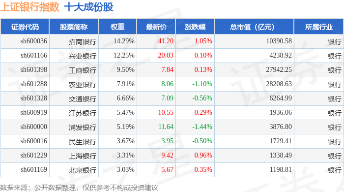 上证银行(000134)指数十大成份股详情如下: