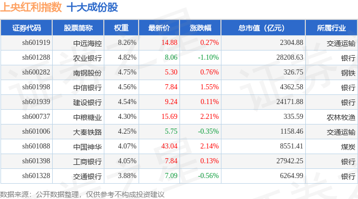 上央红利(000152)指数十大成份股详情如下: