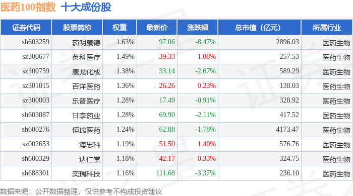 医药100(000978)指数十大成份股详情如下: