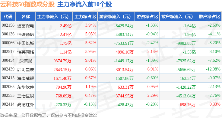 资金流向方面,云科技50(399279)指数成份股当日主力资金净流出合计130.04亿元,游资资金净流入合计54.7亿元,散户资金净流入合计75.34亿元。成份股资金流向详情见下表: