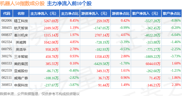资金流向方面,机器人50(399283)指数成份股当日主力资金净流出合计47.13亿元,游资资金净流入合计18.88亿元,散户资金净流入合计28.26亿元。成份股资金流向详情见下表: